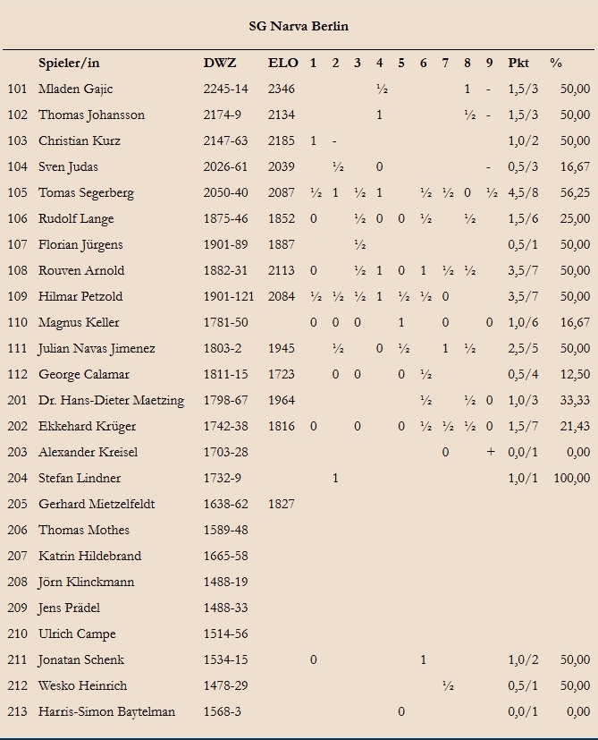 Nr NameDWZ 1. Van Den Berg 2222 2. Daverkausen 2094 3. Lenhardt 2046 4. Düren 2009 5. Segerberg 1962 6. Milort 1948 7. Harmanus 1944 8. Arnold 1916 9. Özates 1907 10. Idaczek 1893 NARVA Schach Fan Shop