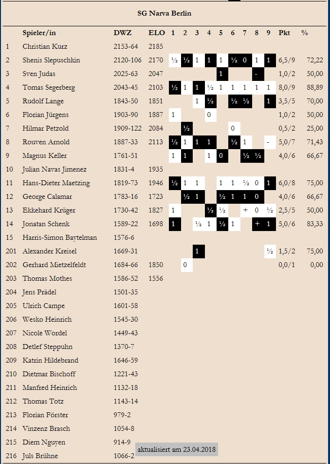 Nr NameDWZ 1. Van Den Berg 2222 2. Daverkausen 2094 3. Lenhardt 2046 4. Düren 2009 5. Segerberg 1962 6. Milort 1948 7. Harmanus 1944 8. Arnold 1916 9. Özates 1907 10. Idaczek 1893 NARVA Schach Fan Shop