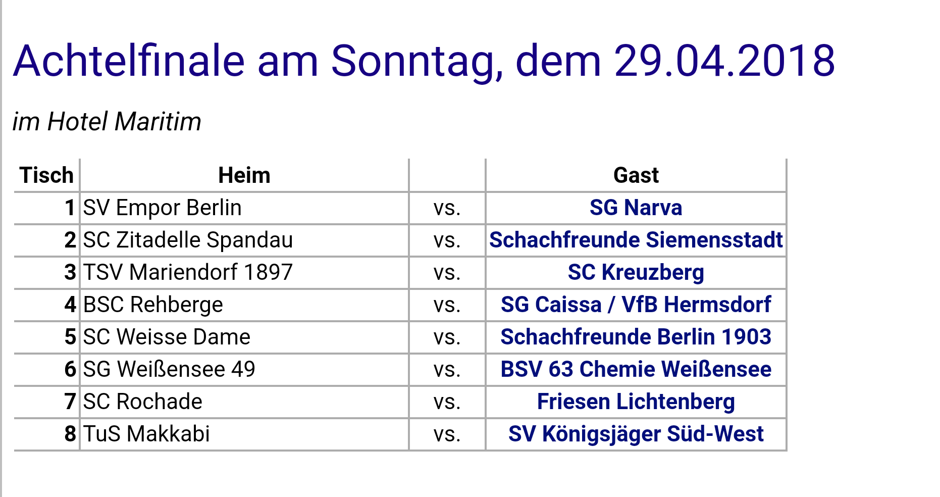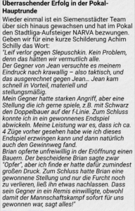 Gestern war die Hauptrunde zum Berliner Mannschaftspokal. Wir mussten gegen die Schachfreunde Siemensstadt ran und waren Favorit. Aber wie schon auf der BSV Seite zu lesen ist: „….Eine Überraschung gelang den Schachfreunden Siemensstadt, die sich gegen die höher eingeschätzte SG NARVA durchsetzen konnten…..„, gab es eine Niederlage.