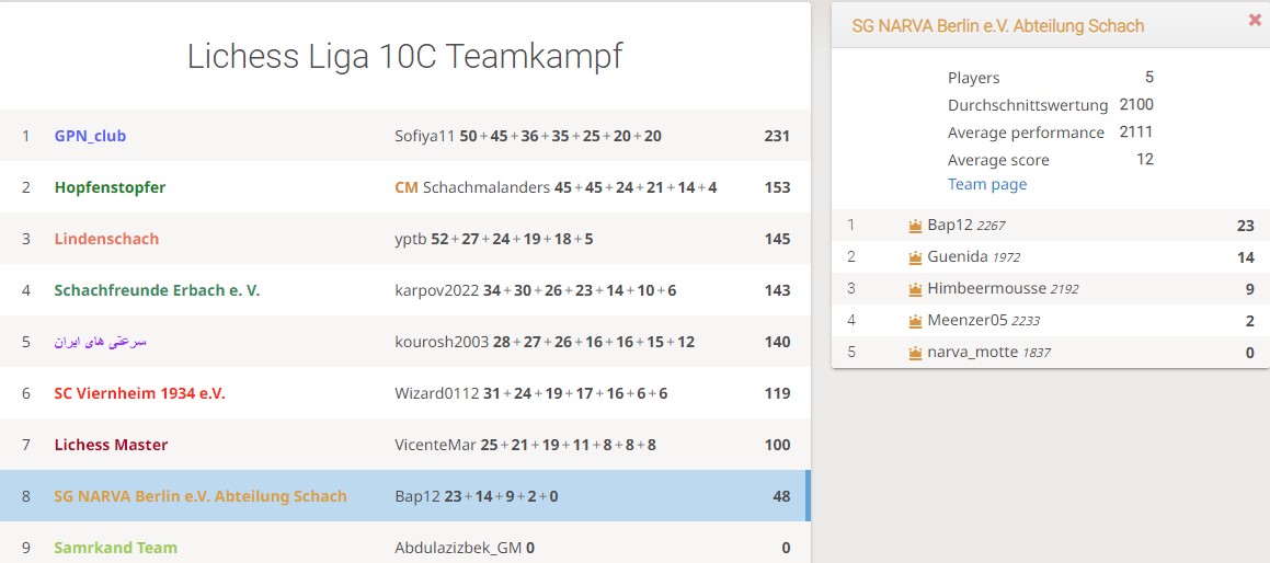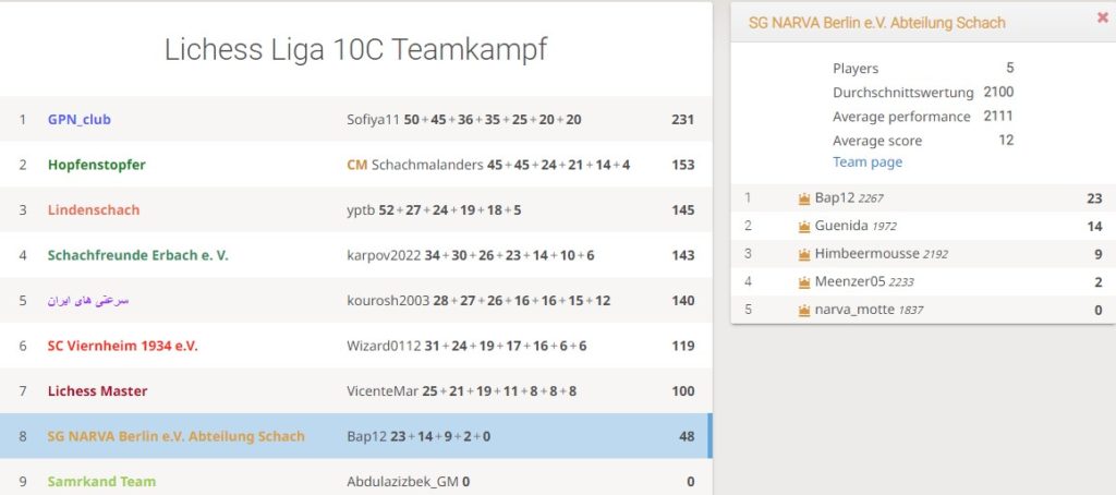 Leider nur der Abstieg, 4 Spieler waren zu wenig, zumal der Meenzer nur eine Partie vom Stau im Elbtunnel aus gespielt hat (und gewonnen!). Bester Mann war Bap12, dahinter Guenida mit 2173er Leistung inkl. 2336 Skalp!
