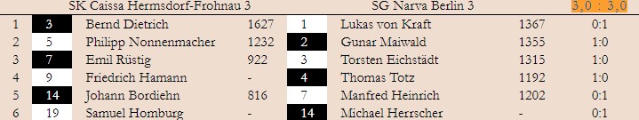 Die 3.Mannschaft kam zu einem 3:3 Unentschieden gegen Caissa Hermsdorf-Frohnau 3. Lukas gewann an Brett 1 – aber nicht wie im Script steht gegen Bernd Dietrich, sondern gegen Bernd Enderlein. Neuzugang Michael konnte direkt seine erste Partie gewinnen! Außerdem gewann auch Manfred. Gunar, Torsten und Thomas musste sich DWZ-schwächeren leider geschlagen geben.