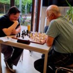 Im Spitzenspiel zwischen Peter und Hans-Dieter gab es ein Remis, Hans-Dieter konnte trotz Minusbauern alle Gewinnversuche von Peter abwehren. Himar, der jüngere, gewann gegen Ulrich und bleibt damit mit 3 Punkten ungeschlagen. Auch bei 3 Punkten steht nun Ekkehard, der beim Jakobsweg Kraft getankt hat und im eigentlich ausgeglichenen Damenendspiel noch Jonatan eiskalt überrumpelte.