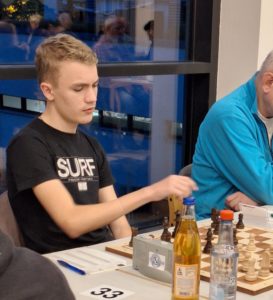 Tom kam als Nachrücker am Samstag spontan ins Turnier, Jonatan musste kochen und wir brauchten einen anderen Gerademacher. Er spielte dann das Turnier durch. In Runde 6 kam sein Gegner nicht….die anderen Runden liefen nicht ganz nach Plan, die 3,5 Punkte (davon 1,5 erspielt) reichten zu Platz 50.
