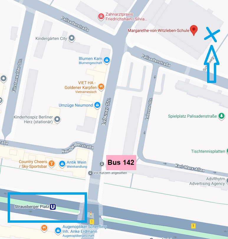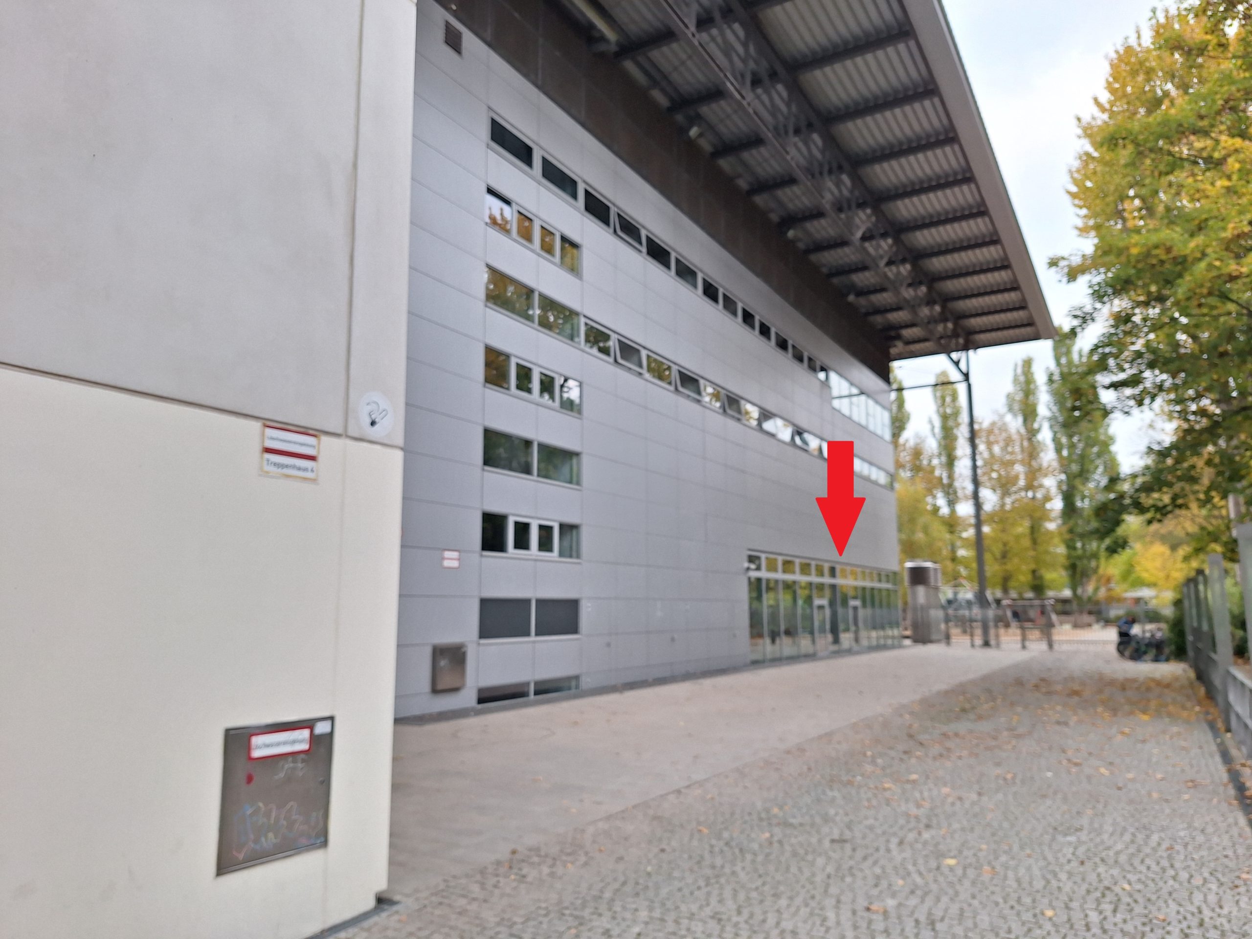 Die Schule liegt unweit vom U-Bahnhof Strausberger Platz. Wir spielen in der Cafeteria, die ohne Stufen zu erreichen ist.