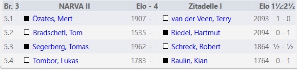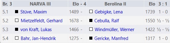 NARVA 3 konnte dagegen den ersten Sieg einfahren! Mit einem klaren 3:1 Sieg gegen Berolina 2 hat man nun auch die rote Laterne abgegeben. Stark die Siege von Maxim und Jan-Hendrik!