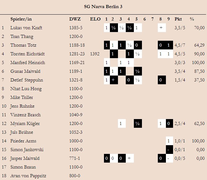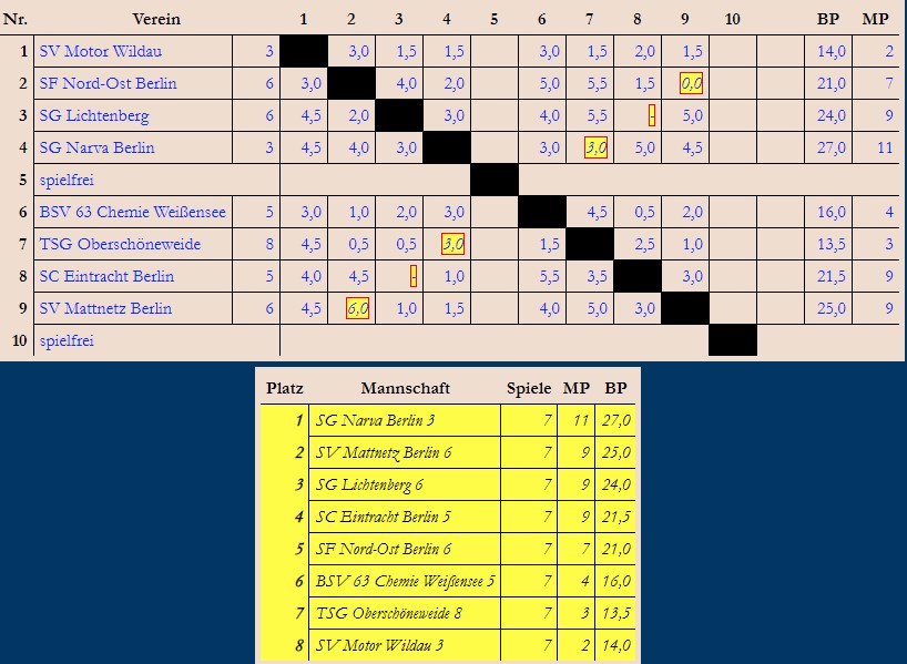 Die Saison 2019/2020 wurde wegen der Corona Pandemie im März 2020, nach Runde 8, unterbrochen. Runde 9 wurde im August 2021 nur für die Mannschaften nachgespielt, für die es noch um Auf- / Abstieg ging. Als Aufstiegsanwärter musste NARVA 3 gegen TSG Oberschöneweide spielen.